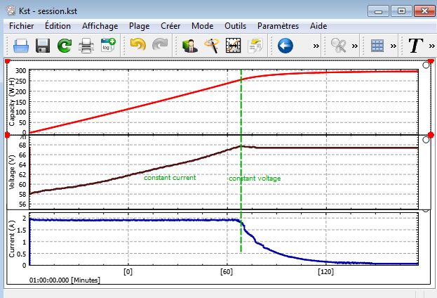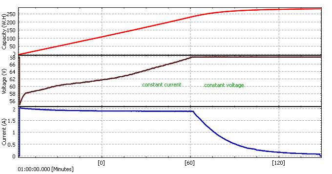 А здесь непонятна начальная просадка напряжения до 55V. Может, батарея ещё не успела восстановиться после нагрузки, и её сразу поставили на зарядку. Фиг знает, я не специалист. Тем не менее, 55V (3.4V на ячейку), это тоже далеко не ноль (2.5V).