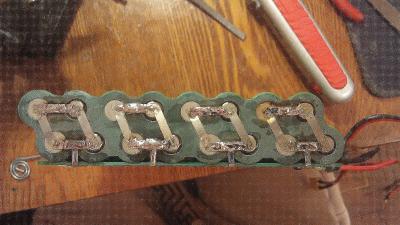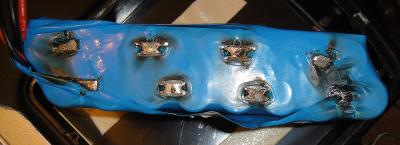 Ремонт заключался в восстановление перемычек между ячейками. Там где немного обуглилось, просто нанес флюс (ЛТИ-120), предварительно или после немного пошкрябав по поверхности для снятия оксидной пленки и залудил обычным припоем. Там где перемычки полностью выгорели, подложил нужного размера кусочек залученной никелевой ленты и так же припоем восстановил перемычку. Соответственно использовал паяльник :)
