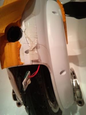 А вот дальше случилось печальное: ещё через пару километров при прыжке с неожиданно высокого поребрика я соскочил с колеса и оно, несмотря на небольшую скорость, треснуло в районе переднего габарита. Электрика в порядке, диод горит, но колесо теперь нужно клеить. Прошу совета, чем это лучше делать: моментальным секундным клеем или двухкомпонентным? Или ещё каким?
