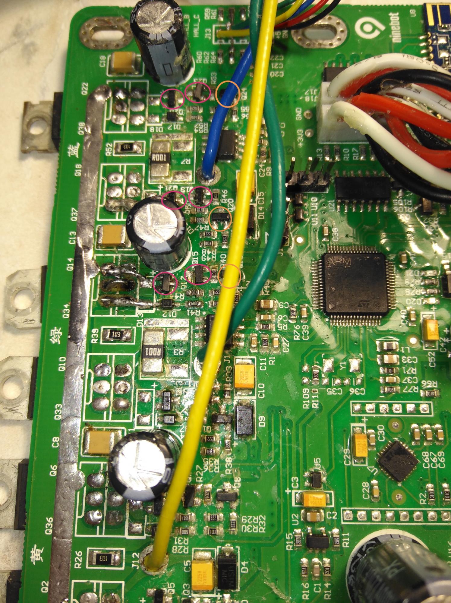 Итак друзья проблема с выбиванием мосфетов решена, делюсь как, может кому пригодиться, дело было так, при включении колеса выбивало 3 мосфета (всегда в одном месте) после этого колесо уходило в защиту, на плате естественно к.з, первыми делом путем кропотливого поиска было найдено несколько мёртвых транзисторов из обвязки драйвера (на фото они розового цвета) меняю включаю, колесо заводится но при наклоне истерично дергается, понимаю что проблема с подачей тока, меняю стабилизаторы, они у меня под маркировкой G1 (на фото помечены оранжевым цветом) и вуаля порядок! Всем удачного ремонта, но лучше без него.