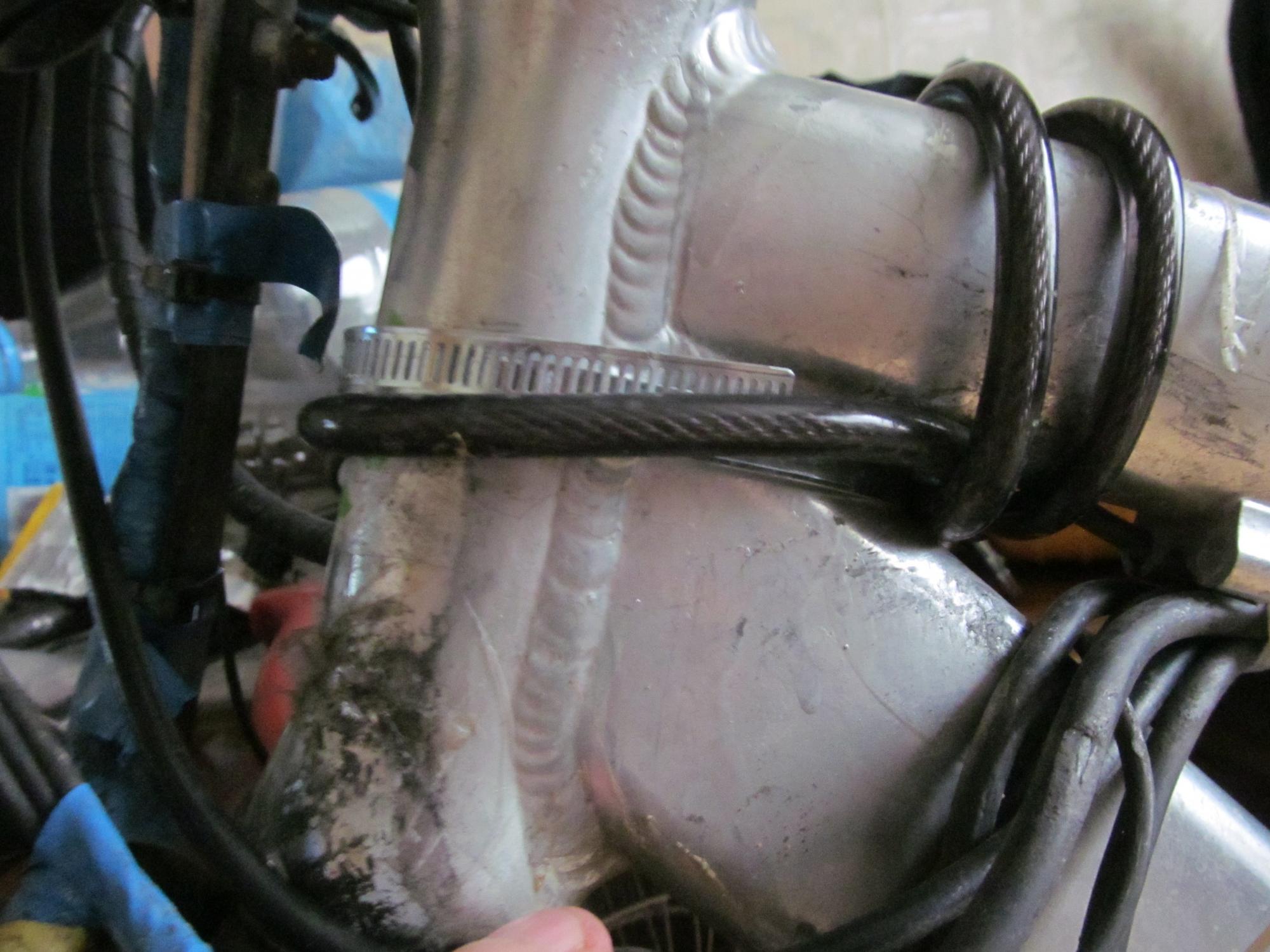 Я на своей алюминиевой раме и за передний, "рулевой" сварной шов беспокоюсь, хоть он значительно меньше нагружен чем середина рамы, но на всякий случай сделал на месте этого шва вот такую перевязку, "замковым тросом", чтоб если вдруг сломается резко, не сразу вниз мгновенно рухнуть, а было 1-2 секунды сгруппироваться при падении, кода рулевая зацепится на торосе. Хоть шов здесь, "весьма могучий".