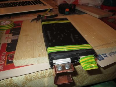 По краям батареи текстолит 1.5мм, на верхней пластине фрезой нарезаны контактные площадки для припаивания разъёмов под БМС и контроля/подзарядки элементов по-отдельности. Разумеется все соприкасающиеся плоскости элементов/текстолита/профиля проклеены двусторонним скотчем, чтобы не съехали.