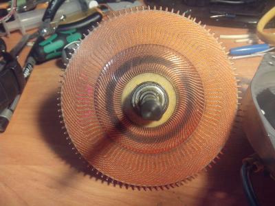 Обмотка однофазная, поэтому запуск происходит с ручного толкача, питание от понижающего трансформатора от сети 50 Гц.