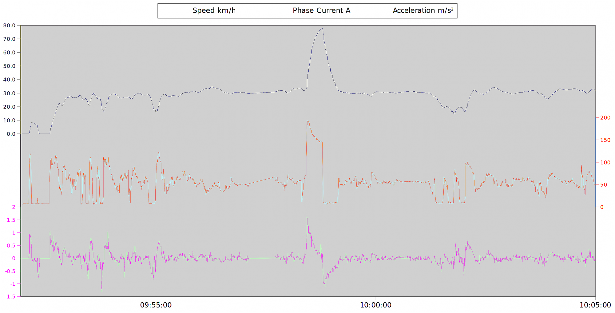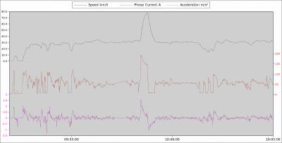 Что-то ничего полезного из графика не удалось выудить, вот первые 15 минут, остальное примерно так же. Скорость, фазный ток, ускорение. Пока ничего выдающегося кроме скорости.