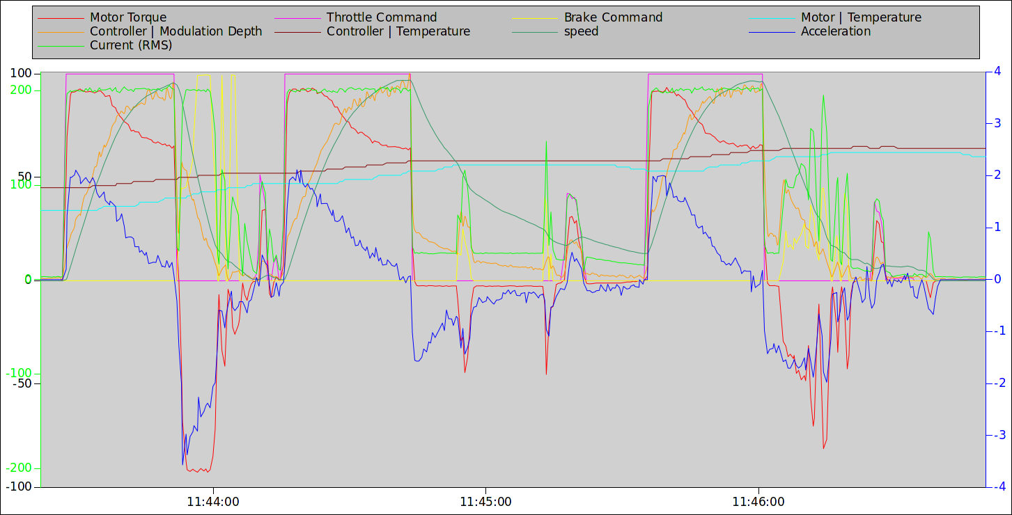 Немного графиков с сегодняшней поездки нарисовал. Из них видно, как мотор набирает таки температуру при разгонах, не сильно-то и меньше чем в конце торможения.