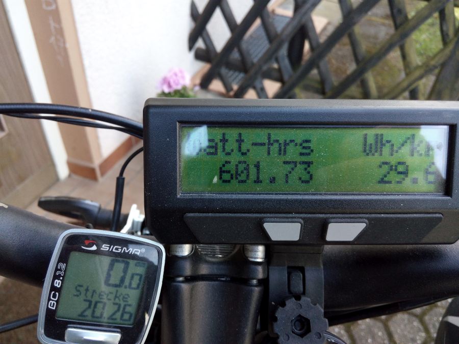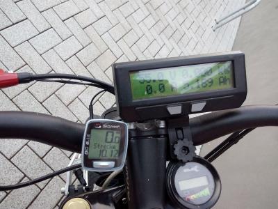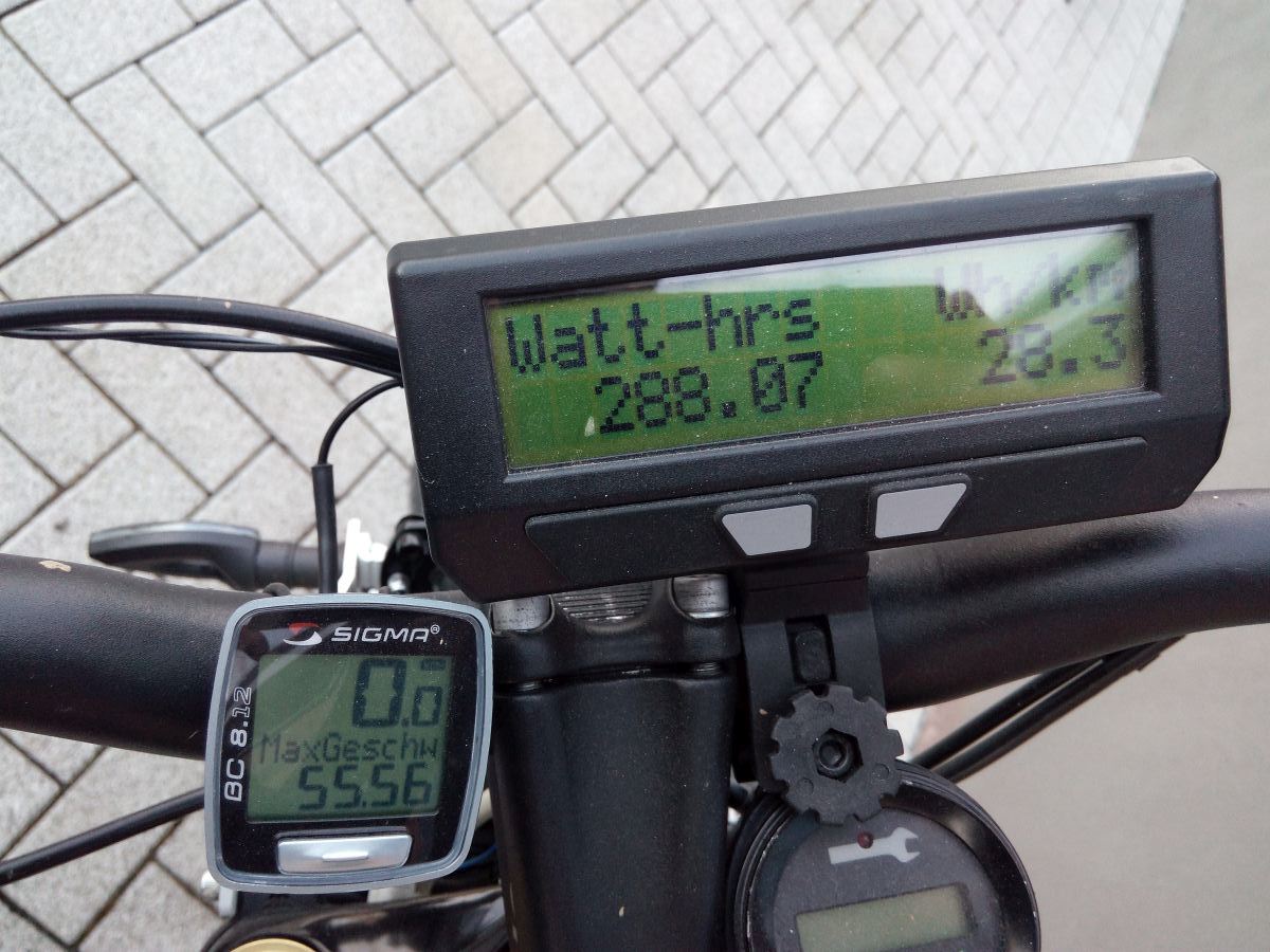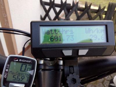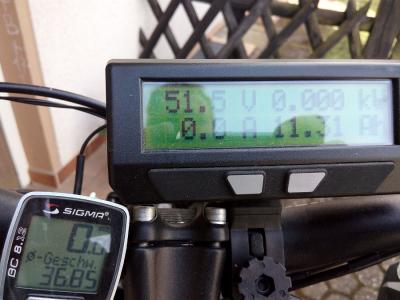 На прямом участке без дёргания газом, на 50 км/ч необходимо почти ровно 1 кВт мощности с батареи. Точнее сказать 1030 Ватт. Засекал на двух ровных участках. Самый больший показатель мощности при подъёме на последнем участке 3350 Ватт при скорости 35 км/ч.
