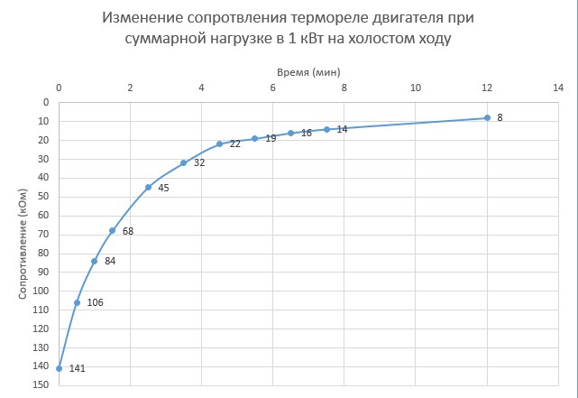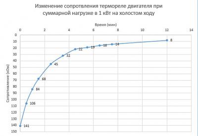 Оба контроллера на холостом ходу показали себя прекрасно. Сделал в задней крышке мотора отверстия, подключил вентилятор, но на полной холостой мощности (48 воль + 12 вольт - около 1кВт) он всё равно быстро греется. Подключил мультиметр к термодатчику и записал показания во времени. Не уверен только как привязать к реальной температуре.