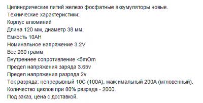 [user]cncfreak[/user], Ну и там же и покупает , вот только за цену , в два раза дороже 75 ю никто не покупает , да и вряд ли кто будет . Ха , за 75 юаней 10 амперный аккум , смешно , когда можно купить 15 амперный за 32 юаня , с ёмкостью близкой к номинальной https://item.taobao.com/item.htm?spm=a312a.7728559.2014082902.1.E3GuIs&id=521217413583&_lang=zh_CN:TB-GBK&thwarea=hw&toSite=main В итоге по сравнению  с 10 амперным за 75 ю , 15 амперный выгоднее в 3. 3 раза  :laugh: