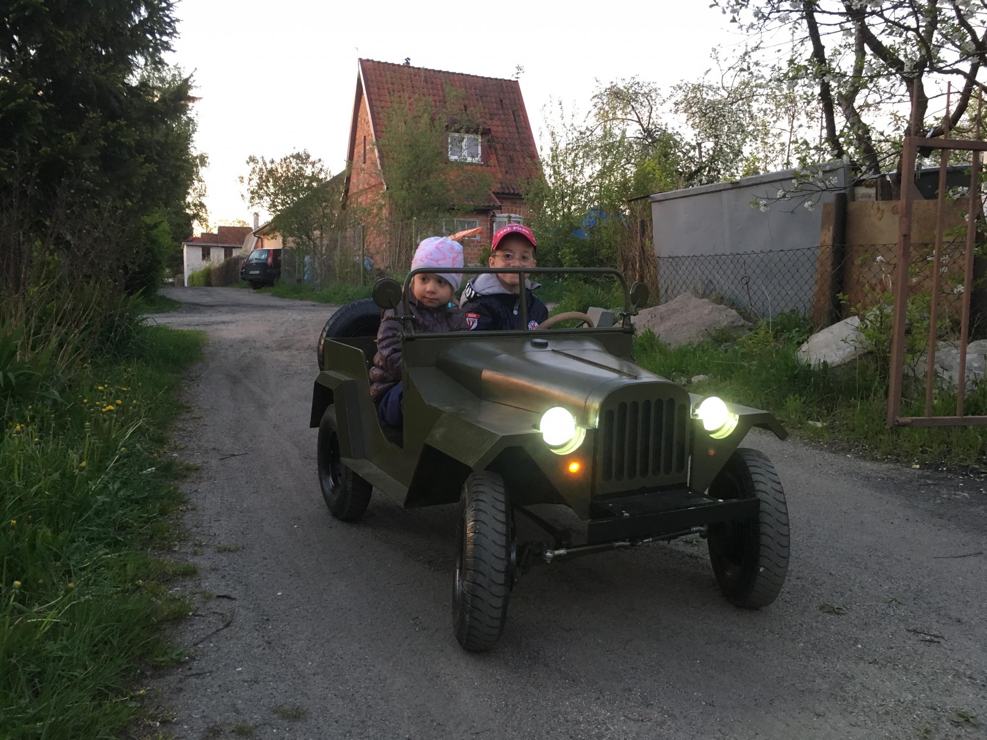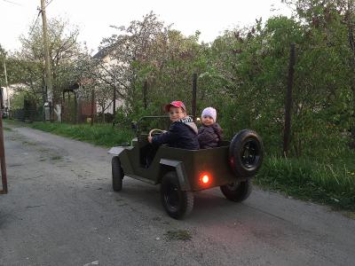 Поздравляю! Отличный результат.  Качество исполнения на высоте! Каковы технические характеристики? Мощность двигателей, какие источники питания применили, какую скорость развивает автомобиль? А с видео, все-таки, решитевопрос -- очень интересно посмотреть в движении.