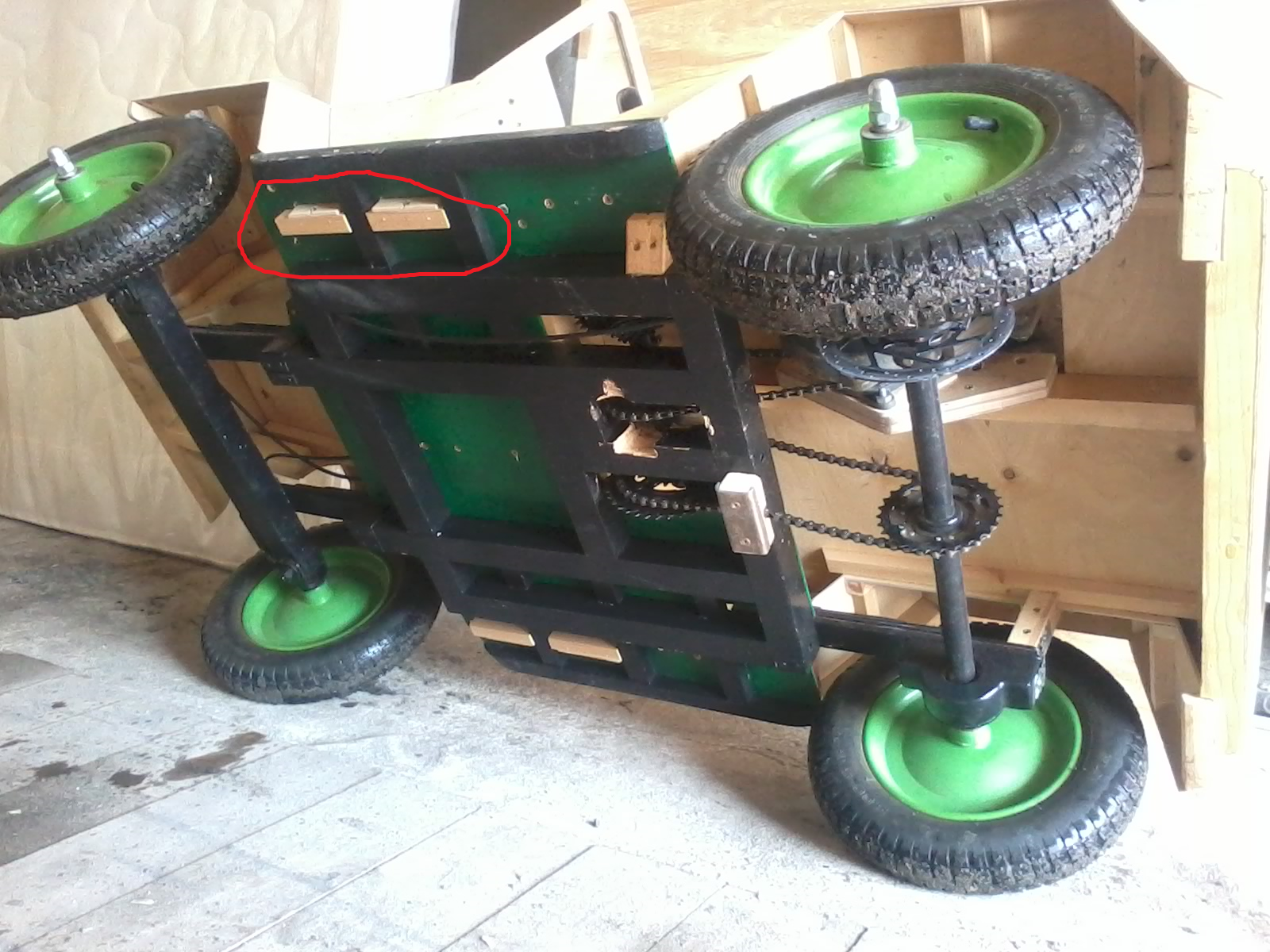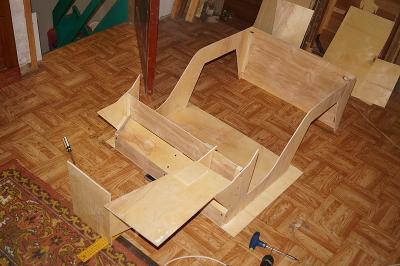 Насчет кузова. Когда будете кроить боковины кузова -- продумайте способ их крепления к днищу в области площалки для ног. В этом месте в нижней части боковины кузова я оставил специальные шипы, а в днище проделал пазы. Боковина кузова вставляется шипом в паз днища. Выступающую вниз часть шипа прикрепляем к нижней части днища при помощи небольшого брусочка, шурупов и клея.
