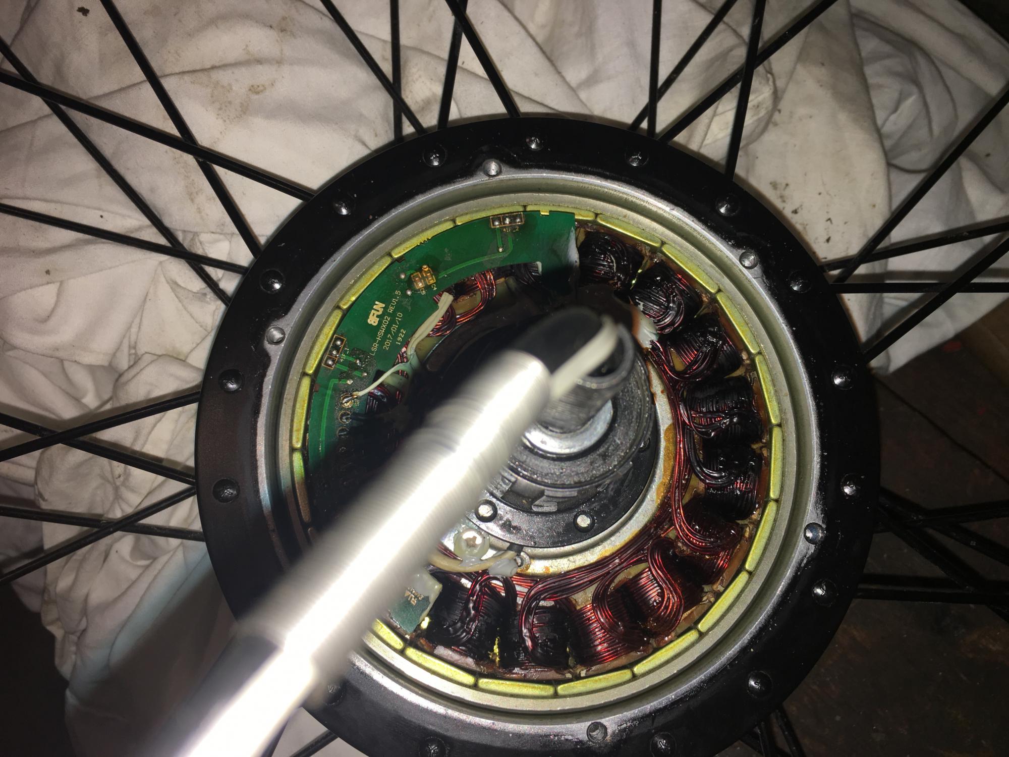 Здравствуйте товарищи! История продолжается. Перемотал, собрал. Одна лайтовая поездка - расплавление припоя. Скорее всего магниты ослабшие, низкий кпд. Или может быть один или несколько датчиков холла не работают, не знаю. Вряд ли виноват контроллер. В сравнении с тем что было, он не буксует, момент на низах ощутимо упал. На одну горку, он раньше поднимался с разгоном, а сейчас просто поднялся. Но 40 км.ч смог выжать на 44 вольтах (под нагрузкой). Показалось рык стал громче. На обратном пути пропала скорость (как выяснилось отпаялись почти все провода от платы). Остановился. Хотел снова поехать, а он не едет совсем, на экране "ошибка 1". Если поехать на педалях, и дать газу, то тянет, и неплохо вроде. Контроллер KT 36/48 ZWSRMT, работает без датчиков холла, если колесо крутнуть. Боковая крышка была настолько горячая, что не мог удержать рукой. Быстро нагрелся, намного быстрее чем раньше. Провод под датчик через ось протянул, но ничего не поставил, поездка была пробной.