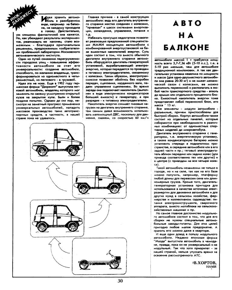 Идея хранить автомобиль в разобранном виде, например на балконе, не каждому приходила в голову. Действительно, уж слишком фантастичной она кажется. Но, как убеждают результаты экспериментов, реализовать ее наконец стало возможным - благодаря оригинальным решениям, предложенным изобретателями проблемной лаборатории Московского автомеханического института.