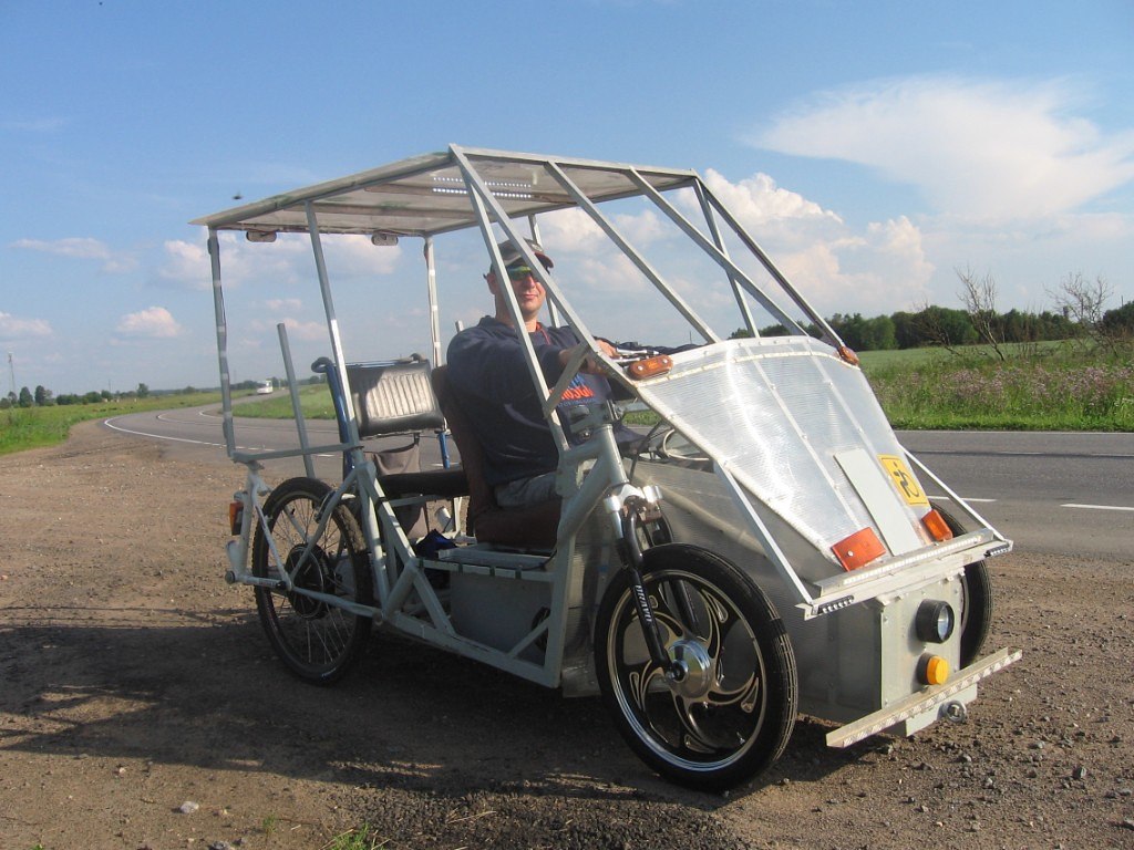 Предлагаю автору темы рассмотреть такой вариант,коляска то уже есть, немного доработать и обязательно заднюю подвеску на амортизаторах.Зато не один мулиционер не докапается велосипед  и все тут.Выложил наш с братом апарат инвалидную электрофицированную коляску на двух человек(багажник взади для перевоза обыкновенной коляски ) за два года обросшую крыше,обтекателем,светотехникой.Имеет передний ,задний ход 2шт ДД по750Вт  акб 48В,свинец 52Ач скорость  33-45км.ч.средний запас хода 15-20км.,работаем над литием.Я к чему это пишу у нас конструкция реализована так чтоб посадить пилота пониже,может вам тоже взять это на рассмотрениено только в варианте ТРИЦИКЛА.