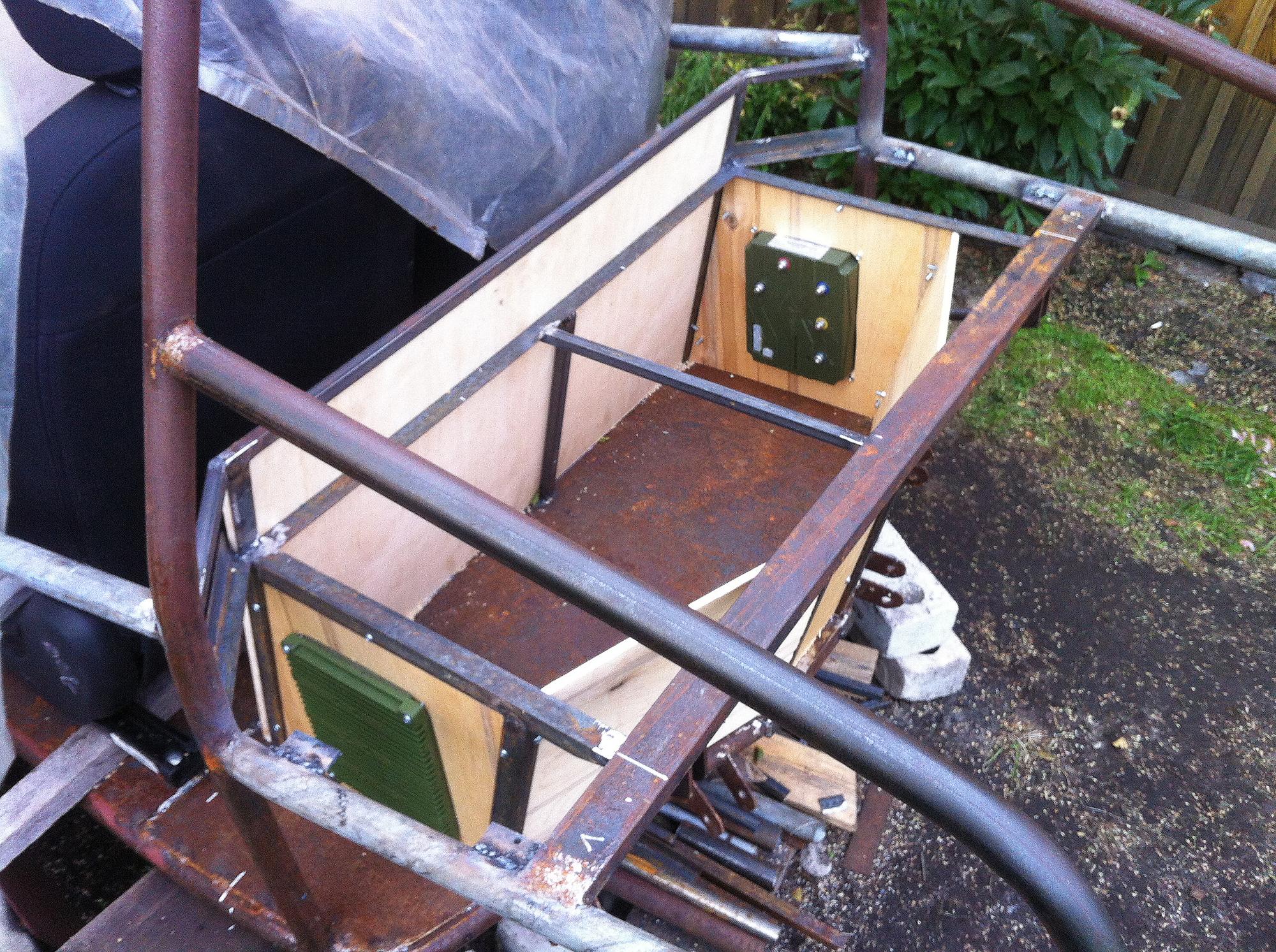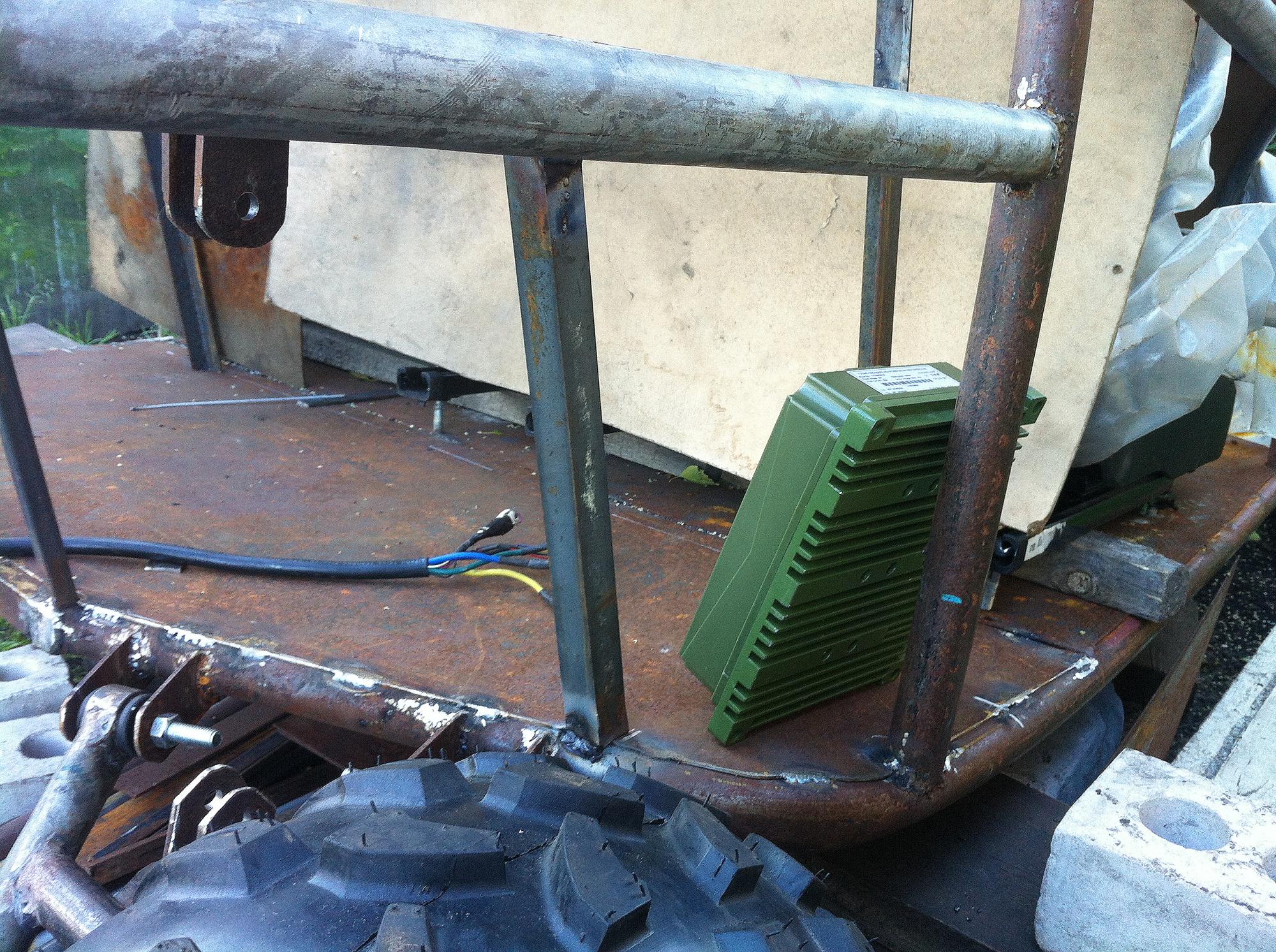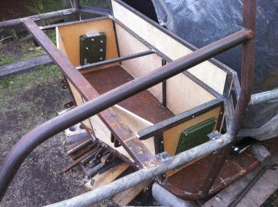Доделали ящик - пока еще громко сказано. Но по крайней мере, каркас и стенки сделаны. Остается дно ящика, т.к. не хочется оставлять его железным - планирую туда положить фанерку, к ней будет удобно прикручивать и стяжки, и DC-DC-конвертер, и фиксаторы для аккумулятора. Затем - верхняя платформа (12мм фанера), а также "люк" для доступа в "аккумуляторный отсек".