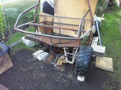 Ну, наконец то есть продвижение, но хотя, как не старались, не успели "поставить на колеса". По крайней мере сделана самая ответственная вещь - крепление рычагов подвески к раме, и все вытекающие настройки-юстировки: развал (по вертикальному уровню), схождение - рулеткой от осевой линии, а затем - между самими колесами. Вобщем, выверено все до миллиметров, и не было ни одной ситуации, типа "эх, убежало немного, да и хрен с ним"  :-)