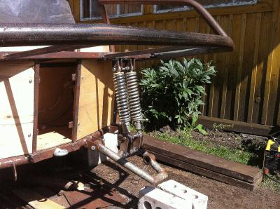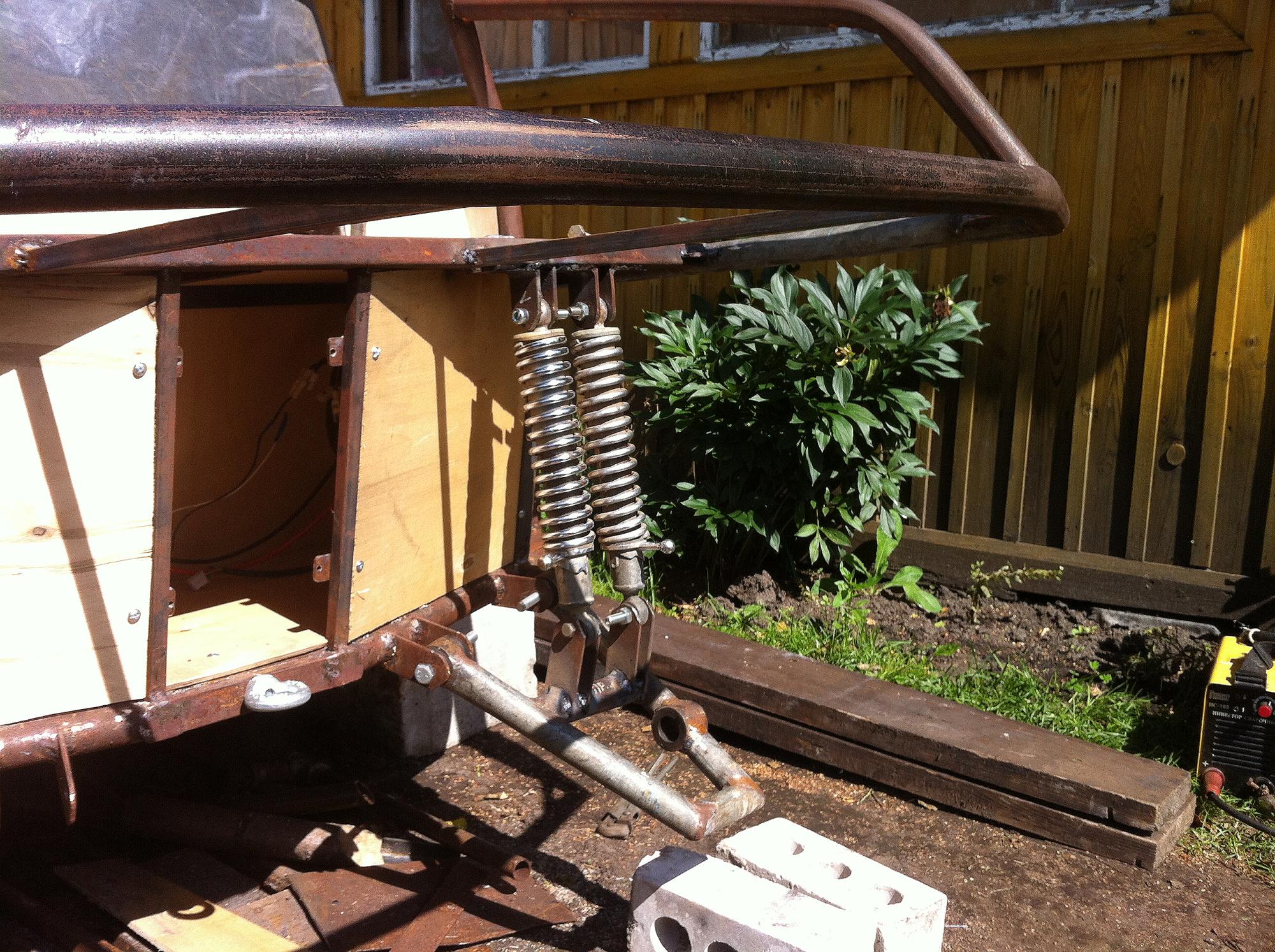 Сегодня прикинули новые (в смысле недавно приобретенные :)) амортизаторы. Я срезал нижние ушки наполовину, просверлил в них новые отверстия (т.к. у этих амортизаторов шток длиннее). Ситуация с "уходом" амортизатора в сторону из-за наклоненных ушек стала лучше, но подтвердилось и другое предположение - о том, что пружины амортизаторов слишком слабые для веса машинки (все-таки они мотоциклетные). Приняли решение, что будем делать сдвоенные. Сегодня пол дня срезал старые ушки и выпиливал новые. Завтра с утра прихватим все и сразу же опробуем.  :run: