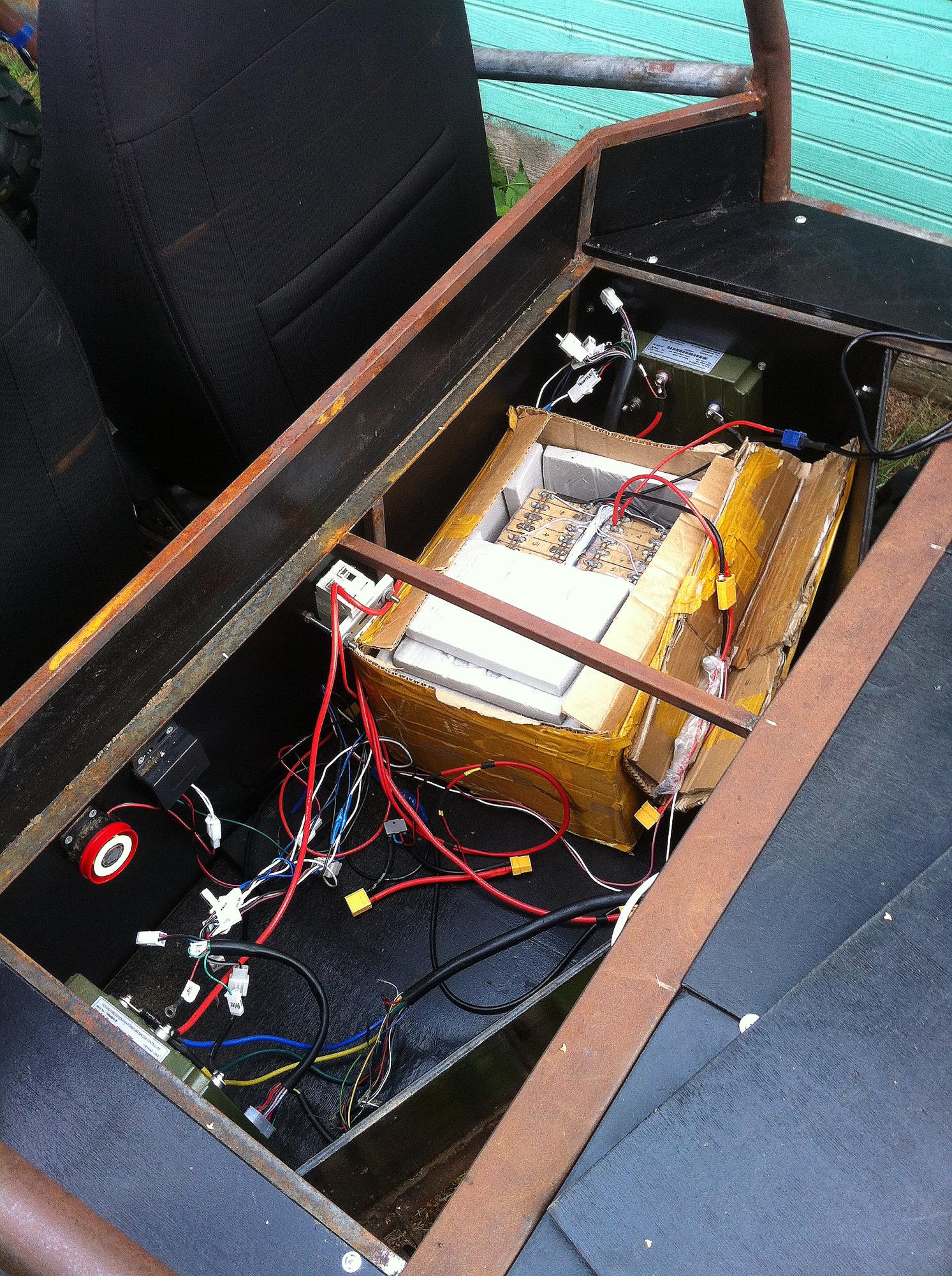 Фотки аккумуляторного отсека. Аккумулятор прямо в коробе ставлю, пока креплений не придумал никаких. Но так как уже твердо решил аккумулятор апгрейдить к следующему сезону - то с креплением этого и париться не буду.