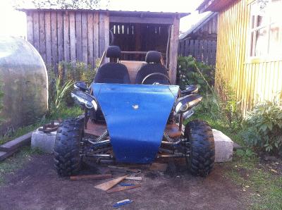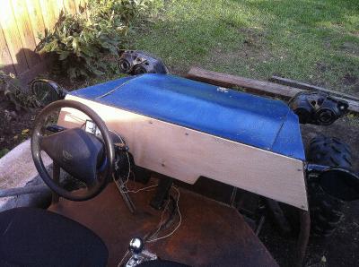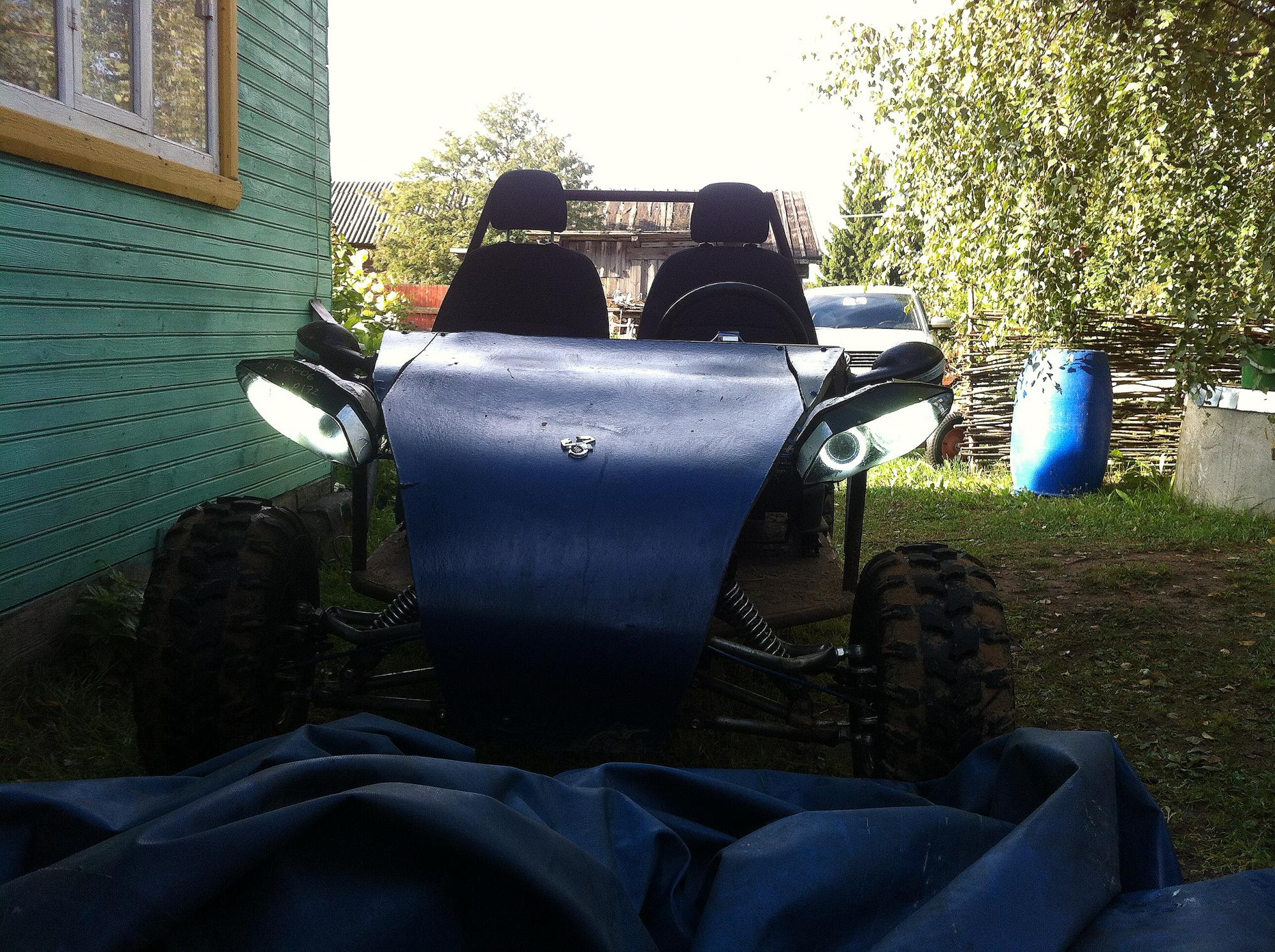А вот фары и приборную панельку (точнее заготовку под нее) - сделали. Фары теперь поставлены с запасом, подальше от колес, испытания показали, что такого расстояния достаточно. Внешний вид, конечно, теперь несколько спорный, уж слишком фары сильно вылезли вверх. Ну, да и ладно, следующим летом обыграем обшивкой, сместим как-нибудь. Подключить фары опять не успел, не хватило времени.