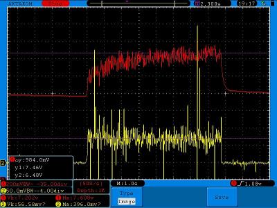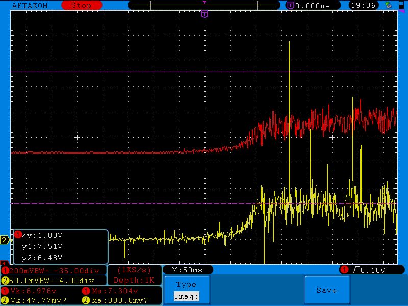 Вот вам импульс 8 сек до отсечки, напряжение на АКБ (красным) и ток (желтым, снимался с шунта ЗУСа) :