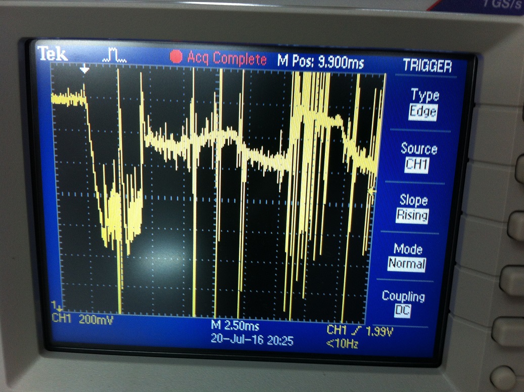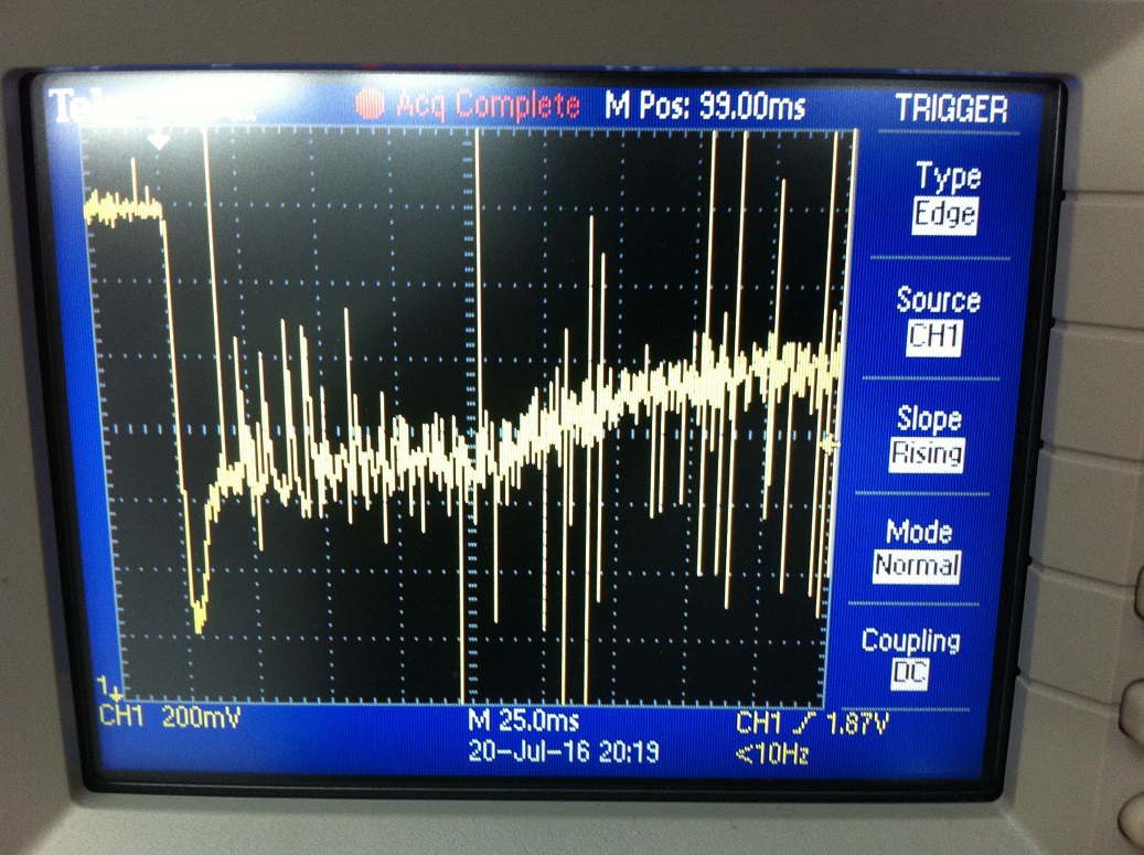 Само испытание заключалось в резкой (скачкообразной) подаче 100%  питания на двигатель и снятия токовых осциллограмм. Т.е. сначала на двигатель ничего не подается, а затем сразу 100%.
