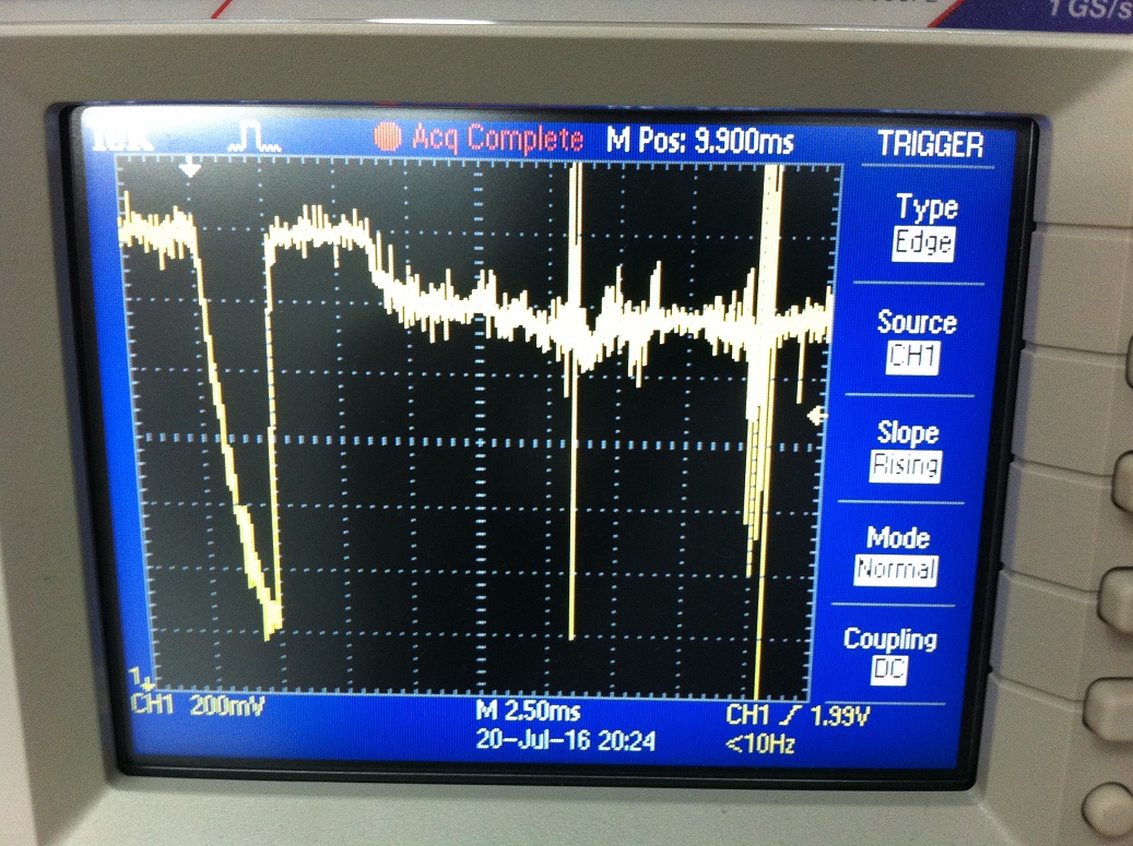 На ней видно, что при резком скачке ток колеблется примерно вокруг 30А, а затем опускается до заданного уровня в 25А. При более мелком масштабе этот процесс выглядит так (в одной клетке по горизонтали 2.5 мсек):