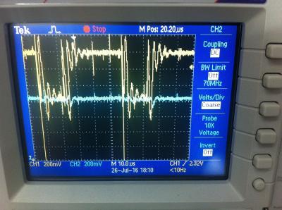 Как видно из предыдущего материала, батарейный и фазный токи имеют разную форму: батарейный является импульсным прерывистым, а фазный - переменным (при синусном управлении его форма представляет собой обычную синусоиду). Для того, чтобы наглядно сравнить эти токи, их осциллограммы желательно наложить одну на другую. Но при вращающемся двигателе это сделать затруднительно из-за их разной формы и временных параметров. Поэтому для того, чтобы стабильно отображать эти токи на осциллографе, можно принудительно остановить двигатель и измерять ток в одной фазе. Остановить можно либо заклинив его тормозом, либо задав неправильный порядок фаз. Ниже приводится осциллограмма батарейного и фазного тока в одной фазе при стоящем двигателе. Желтый график - батарейный ток, синий - фазный. Одна клетка по вертикали - 12А: