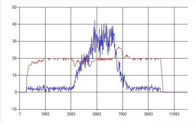 Как я уже писал выше, это такой режим, при котором уровень напряжения с курка газа пересчитывается в скорость, которая должна быть задана. Далее контроллер задает двигателю такой ток, при котором будет выдерживаться эта скорость. Ниже приведена диаграмма, снятая с помощью управляющей программы для контроллера. Контроллер вращал двигатель на стенде с разной нагрузкой, но одной и той же заданной скоростью в 20км/ч. Красный график - это скорость МК, синий - батарейный ток. Напряжение - 50В. Одна единица по горизонтали - 4мс: