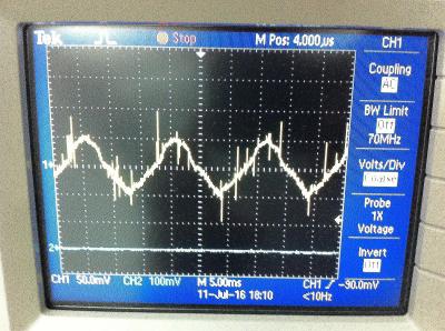 Для снятия осциллограмм подключил датчика тока ACS758 к одной из фаз, и с него на осциллограф.