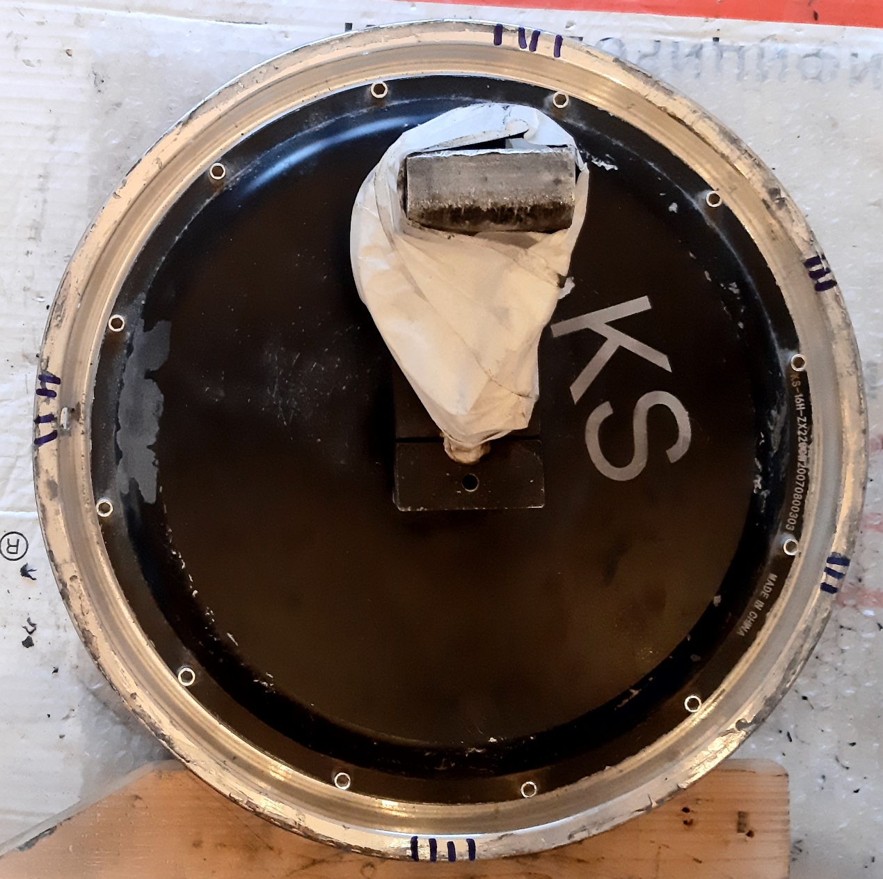 Диск разбортировал, маркером отмечены вмятины для рихтовки (здесь пять, плюс три на обратной стороне). Где почти норм (в пределах 1мм), за вмятину не считаем  :-D
