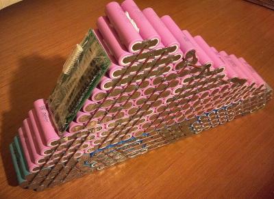 Человек принёс свои хорошо так бэушные банки и попросил собрать из них "что-нибудь рабочее".  Ну штук сорок пришлось выбросить, из остальных собралось пять ячеек и добавили наших Samsung 26F. В итоге получилась батарея 14s16p, долговременный ток без напряга - 45А, вроде собиралось для киловаттного мотора.  Сейчас я б такое собирать постыдился   :ah: