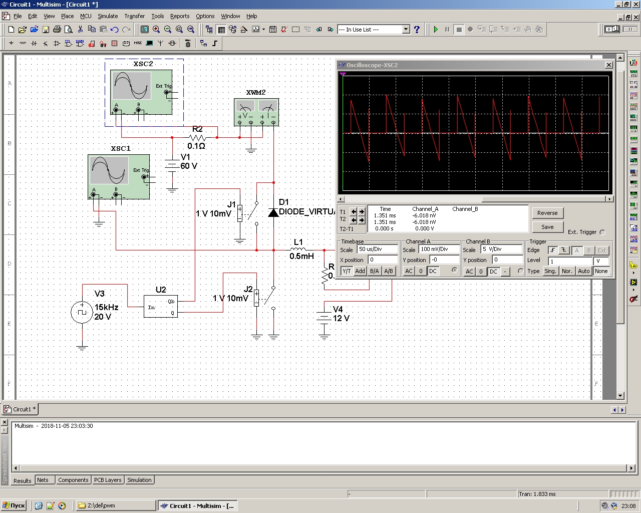Все поправил. Индуктивность 0.5mH. ШИМ 50%, 15кГц.