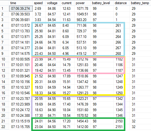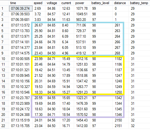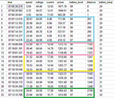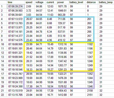 В столбце [distance] видно разрывы в расстояниях между этими участками, в течении которых было обычное движение, а после прохода 2151 метров пути, напряжение на батарее больше не превышало 84 В и в эту выборку не вошло.