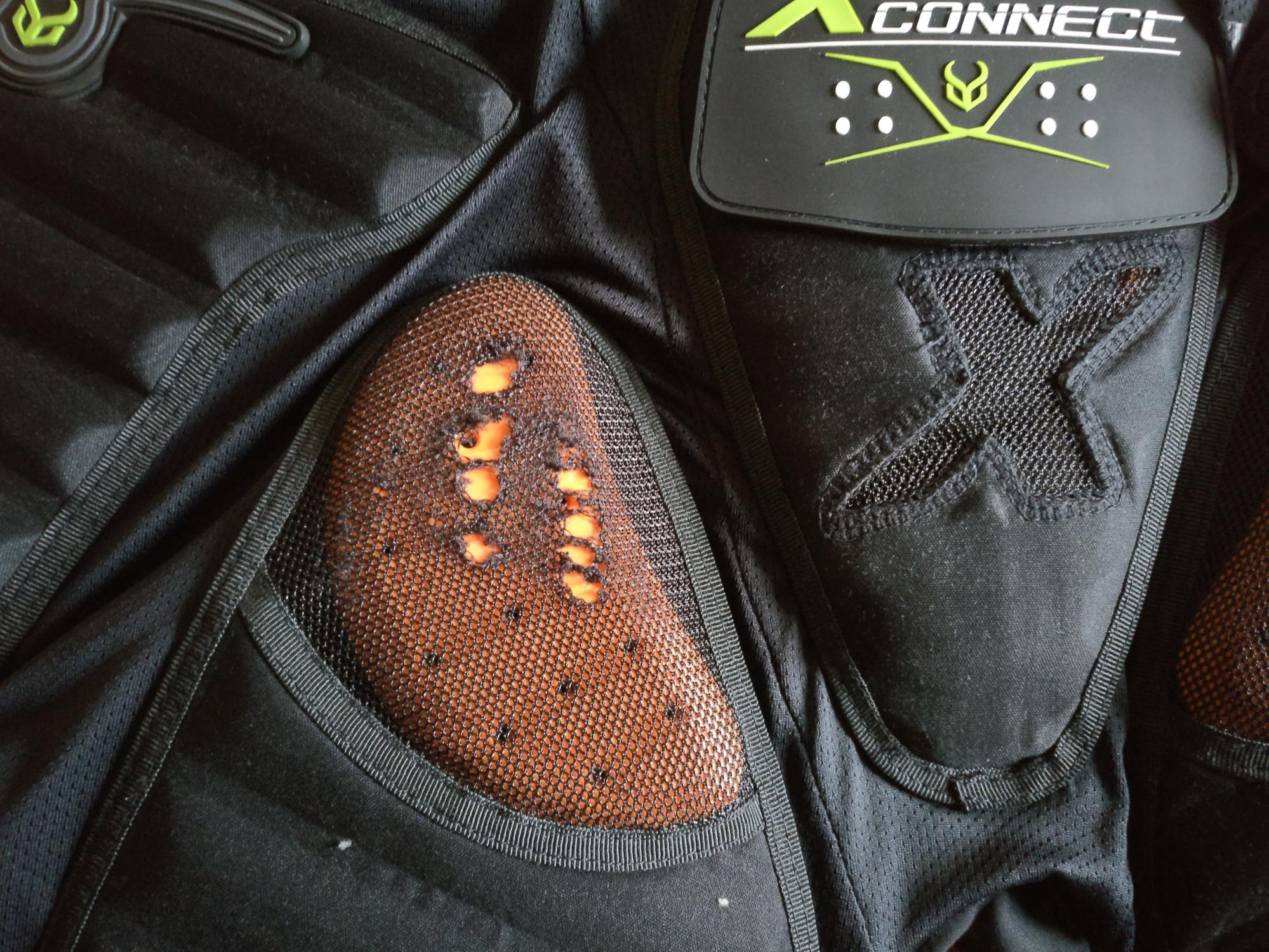 Я смеялся над своими шортами от Demon, что вся попа в защите. Сегодня рубаха и шорты отработали свои деньги. Всегда случается, когда позируешь перед кем-то. Сегодня за мной увязался мелкий самолёт, развернулся, а потом летел параллельным курсом слева от меня. Ну я по асфальту под уклон решил показать и поймал жуткий воблинг. На этот раз я с ним не справился и упал назад. Жуткий удар пришёлся на попу, на спину и на левый локоть. Колесо тут же и осталось в ногах, видимо от наклона при воблинге отключилось. А может сначала отключилось, а потом я упал. Чуть дотронулся сзади фулл фейс шлемом до асфальта, думал, шлем треснул, но следов контакта на шлеме потом не нашёл. Вставать не хотелось. Вытертые вельветки Вранглер порвались, шорты чуть порвались, остальное всё целое. Локоть перед этим пережил два удара и не совсем отошёл ещё, а тут этот жуткий удар. Локоть вращается во все стороны, пальцы шевелятся, но силы в руке нет. Общая боль в руке. Спина и попа в абсолютном порядке.
