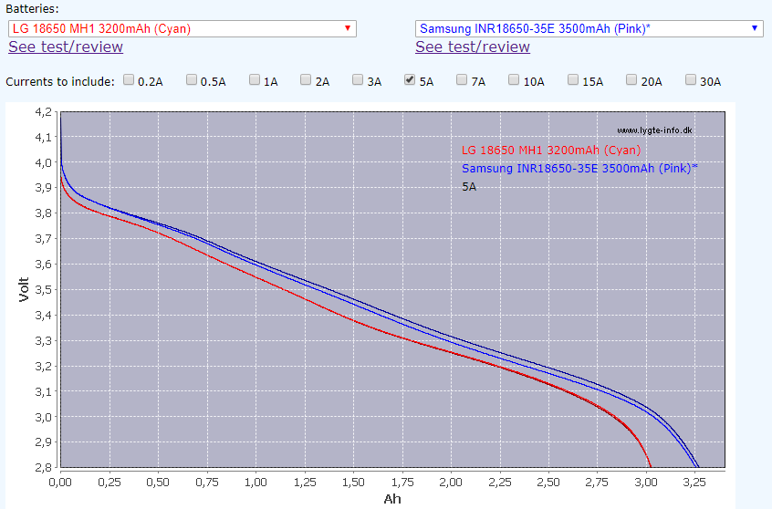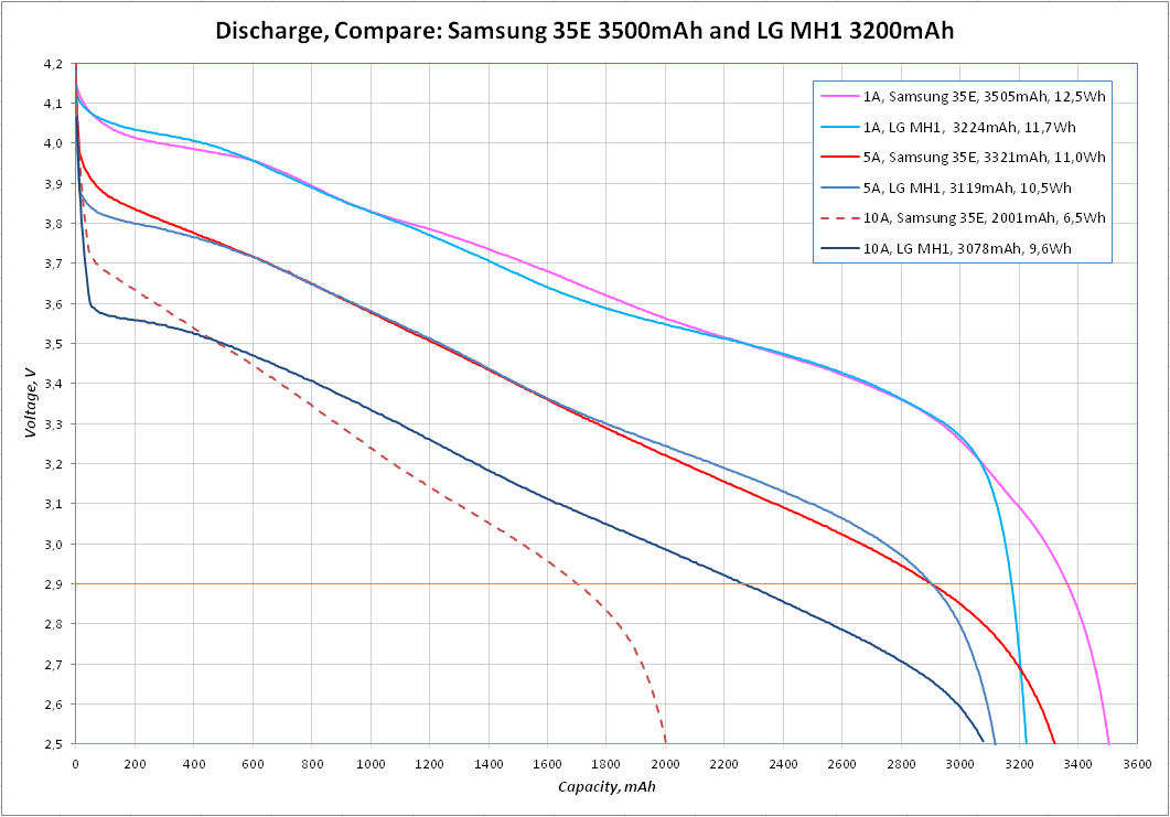 От себя - МН1 лучше держат ток 10А, в то время как 35Е просаживаются глубоко. При токе 5А к окончанию разряда 35Е более горячие чем МН1.
