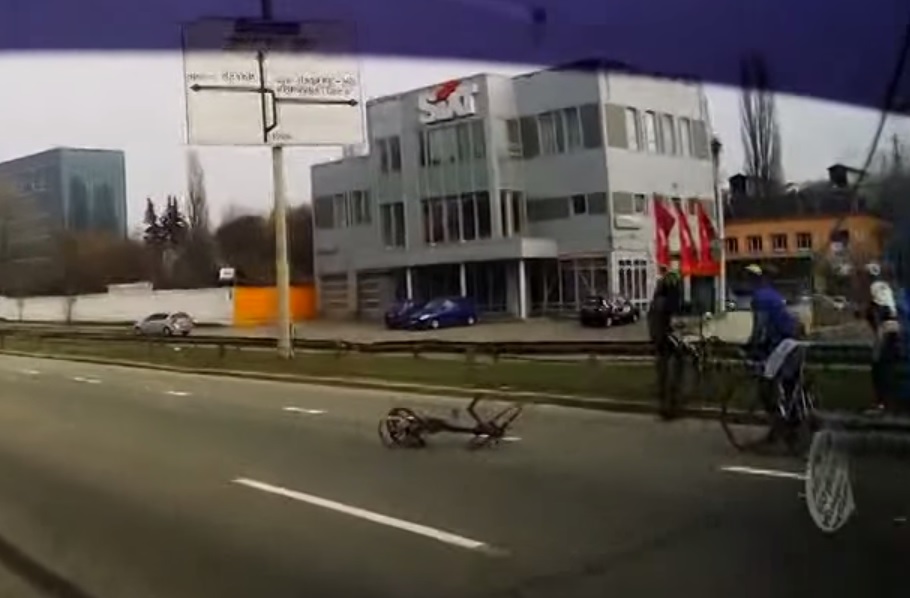 А на видео, если вы слепой - велоcипедисты ехали по первой полосе, ибо на полосе разгона припаркован грузовик, а обочины нет вообще.