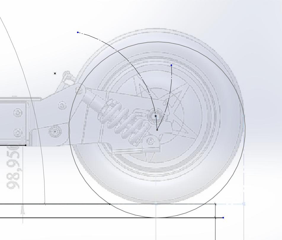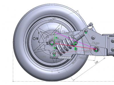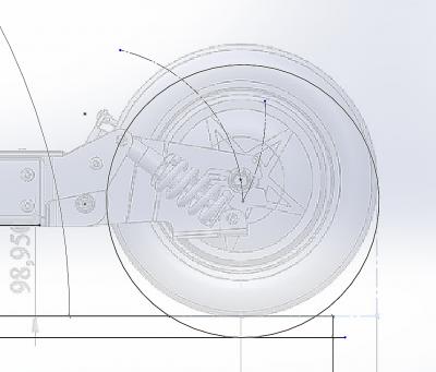 теперь с базой и клиренсом при амортизации: из рисунка видно, что изменение клиренса на 40мм требует хода амовилки в 42мм (что для этой вилки недостижимо, но позволительно для 20" вилки минимакса шестнадцатого), при этом база самоката сократится на 13мм, что составит менее 1,5% и легко компенсируется игрой резины даже 12" колеса