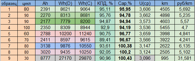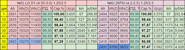 я же писал, что скачки из за того, что ночью температура ниже на 3-4 градуса, и емкость получается чуть меньше, днем чуть больше . Данные с прибора с самого начала не получится взять, чуть выше писал почему, далее немного статистика накопится, скину полную таблицу. в таблице синим цветом помечен момент , когда циклирование было запущено после сбоя.