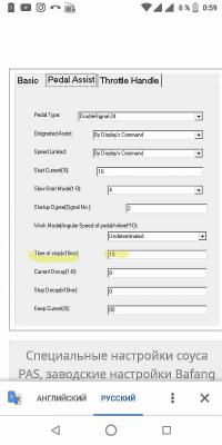 На покатушках заметил одну неприятную особенность,  если еду на ручке газа (газ при этом  настроен на 9 уровень паса) то при необходимости помочь педалями ручка газа вдруг отключалась и мотор переходил в режим ассистента со всеми вытекающими. Например стоял первый пас,  я ехал в крутую горку на ручке газа,   решил помочь педалями а двигатель вдруг резко теряет мощность тк сработало условие ограничения 1го уровня паса. Перестаю крутить педали - начинает работать от ручки с макс мощностью.. В общем  работал либо пас либо газ, вместе они нормально работать не захотели)) это создаввло неудобство тем, что я не мог  получить макс мощность мотора без переключения на повышенный  pas, а щелкать туда сюда не очень удобно. Погуглив форум нашел статью где буржуи отключают пас физически отключая провода в моторе, однако в другой статье нашел что пас можно отключить программно, попробовал - работает.  В общем во вкладке настройки ассистента есть параметр Time of stop,  который определяет как быстро мотор остановится после прекращения вращения педалей, у меня стоял 10.  Установил значение 1 и Pas перестал работать напрочь,  совсем не подключается))  затем зашел в настройки ручки газа и выбрал режим мощности в зависимости от того что на экране.  В итоге получилось что ручкой газа я могу использовать ту мощность,  которая задана уровнем Pas на дисплее.  К примеру если стоит первый уровень - запрограмированная мощность макс 200вт, и она будет всегда независимо от того помогаю я педалями или нет. И что самое важное  двигатель не отключается если помогаю педалями,  крутится с той скоростью которую задаю ручкой газа и с тем током который выбран уровнем паса.  Настроил 4 уровня  1й -200вт, второй - 700вт, третий - 1100вт, нулевой  - макс мощность. В домашних условиях все работает, осталось потестить вживую :)