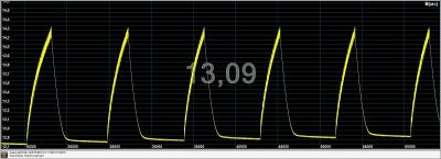 амплитуда импульса 0,3 вольта (14,1в-14,4в), в один импульс влазит всего полтора 35-ти герцовых. Длина импульса 30 миллисекунд.