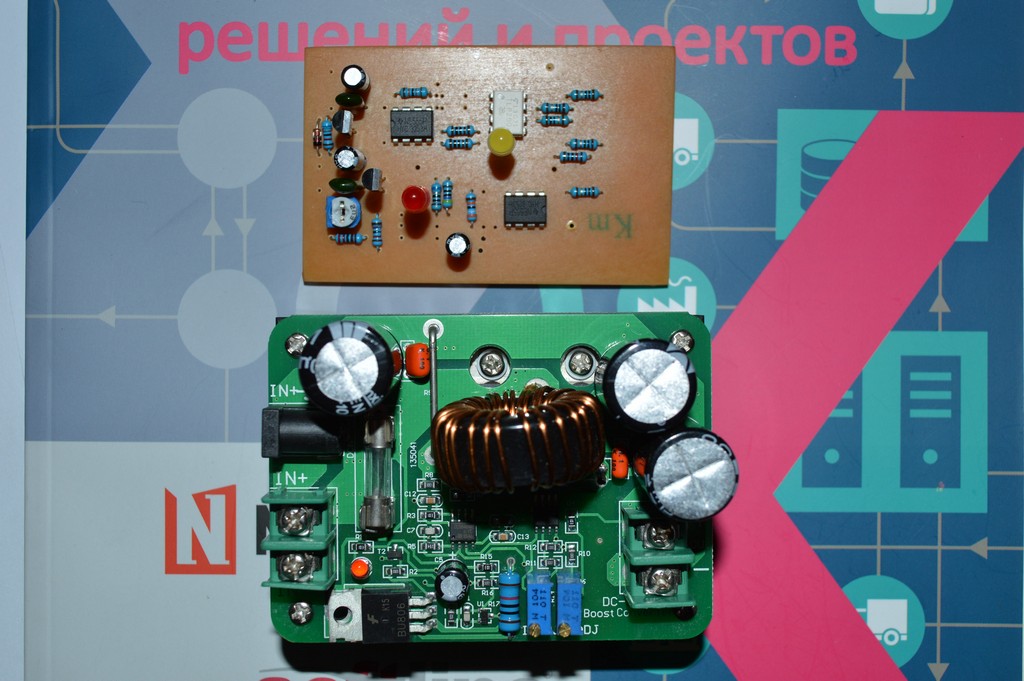 На радиаторе p85nf10, 20100ct, на плате uc3843an, lm358, bu806.