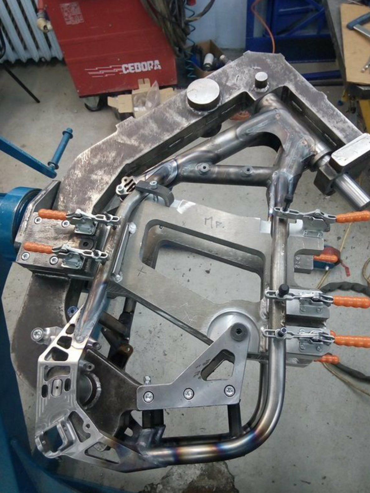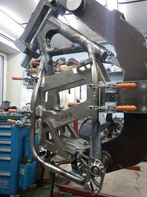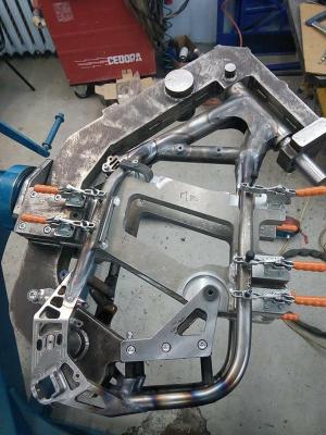Рама DELLER в процессе  производства . Стальной сплав 30ХГСА . Алюминиевые вставки используются для жёсткости и точности сборки элементов рамы .