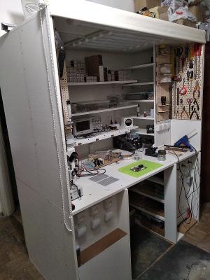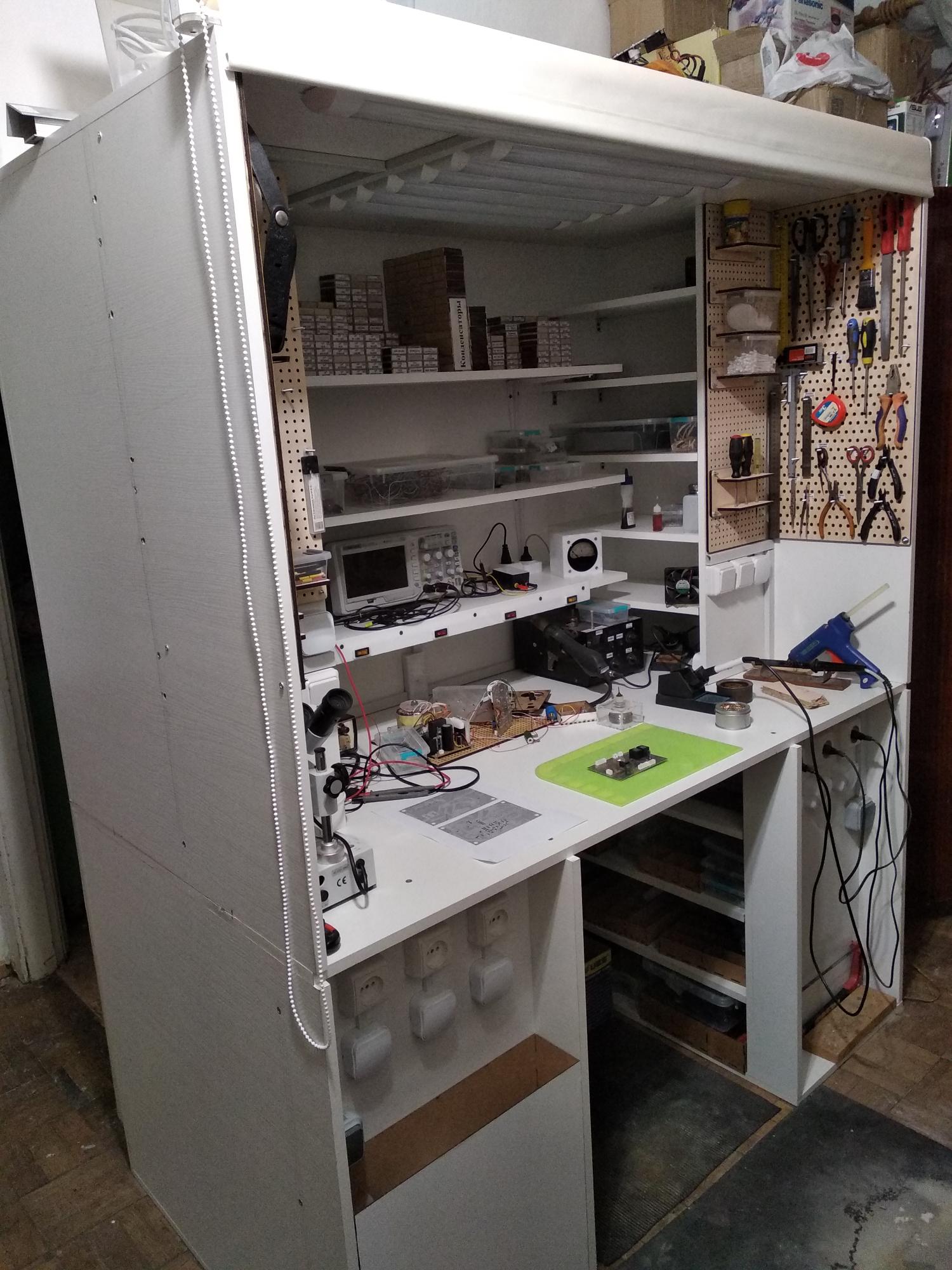 Самодельный монтажный стол-шкаф. Закрывается от пыли и домашних животных рулонной шторой. Куча розеток с индивидуальными выключателями, 7 ламп + 1 для освещения пространства под столешницей. Встроенный съёмный мусорник.