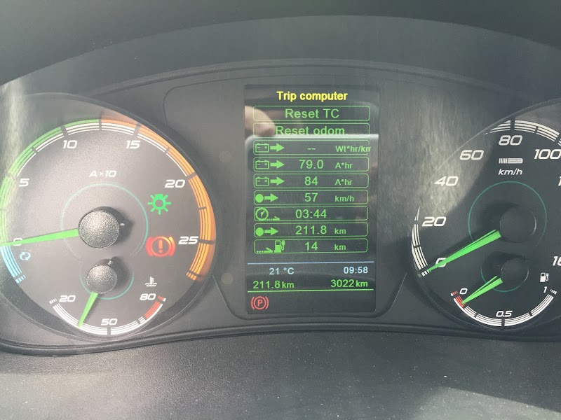 Итого дорога туда: расход 79ач*252.8в/211.8км=94.6 ваттчас на км