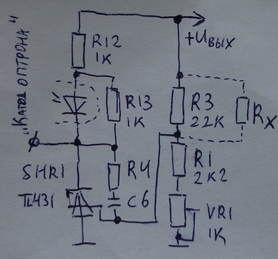 Чтобы добавить сюда дополнительную обратную связь с внешнего усилителя ошибки, (грубо говоря, компаратора), например, для задания тока, надо, чтобы при достижении заданного тока на входе ОС устанавливалось номинальное напряжение стабилизации. В данном случае, для подключения к неинвертирующему выходу усилителя ошибки моей моргалки, выполненном на LM358 через резистор 2k2 и диод LL4148, нужен дополнительный последовательный резистор 15k.