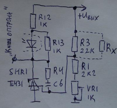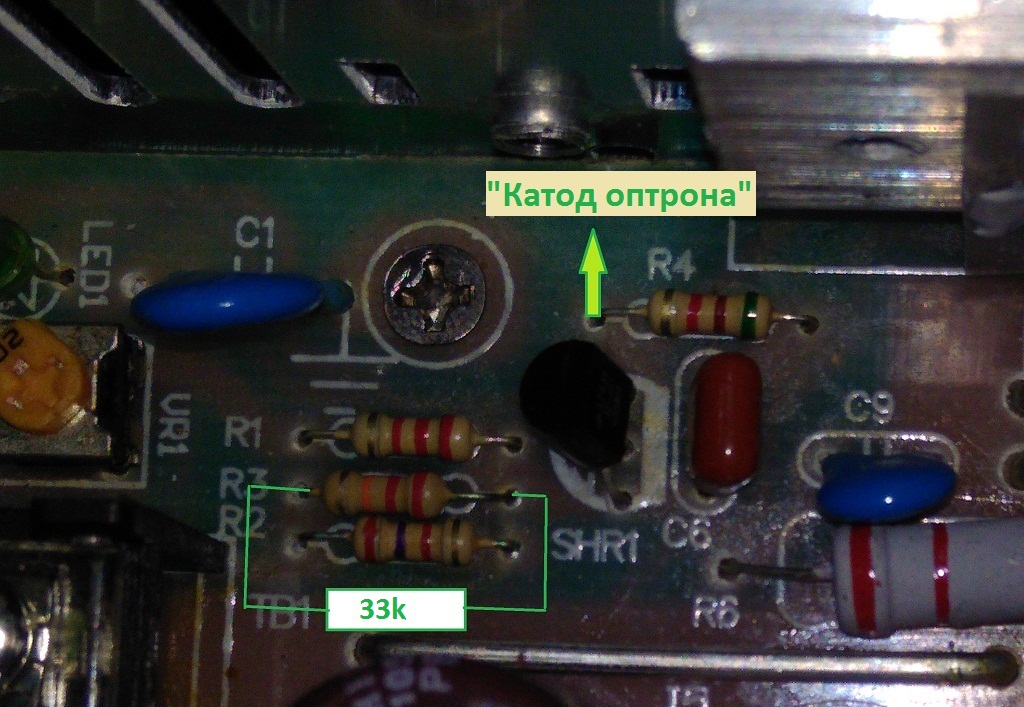 Добавочную обратную связь с выхода с открытым коллектором усилителя ошибки задатчика тока моргалки паяем к отмеченному выводу R4.
