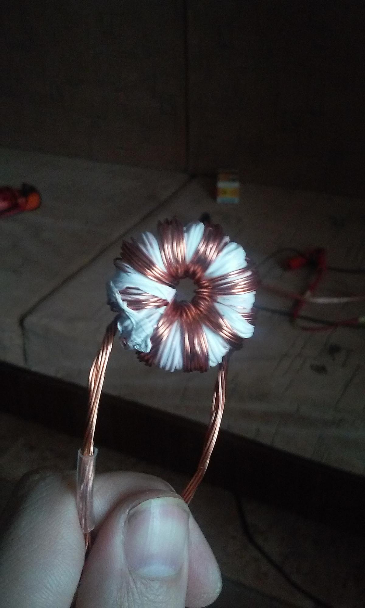 Выглядит устрашающе, как работает, неизвестно. Припаял к отбрывкам старых проводов. Сама катушка стала уже не очень горячая, а такая, хорошо теплая, если не дуть на нее вентилятором. Но что там кольцо, какой температуры, неизвестно, теперь там пощупать нереально. Сами выводы трогаю - не горячие. Оставлять этот идиотизм, или нет? Кольцо большего диаметра, понятия не имею, где брать.