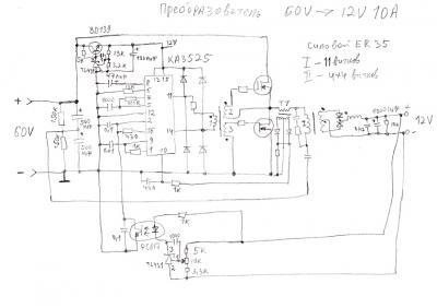 По себестоимости этот преобразователь выходит в пределах 500 руб. Он имеет защиту по току, спалить его у меня не получилось. Единственное что я изменил, это поставил дежурку на 12 в, а не стабилизатор как по схеме я выкладовал, для питания микросхемы и ТГР. Ток потребления преобразователя на холостом ходу 40 ма. Дежурка нужна для того, чтобы под нагрузкой запустился преобразователь, так как ток потребления в момент пуска 0.5 А пол секунды. Можно вместо дежурки поставить обычный стабилизатор на резисторе и стабилитроне, но стабилитрон должен быть д815, на ток 1 А. В основном все детали использовались с негожего компьютерного БП. Рассчитать преобразователь можно на любое входное и выходное напряжение и ток.