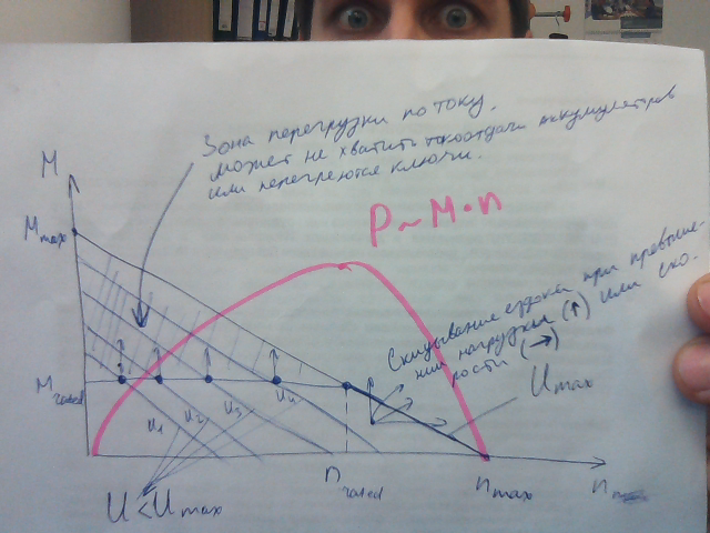И чтобы появился момент при неизменной скорости, нужно поднимать напряжение, это возможно в точках ниже/левее номинальной.