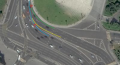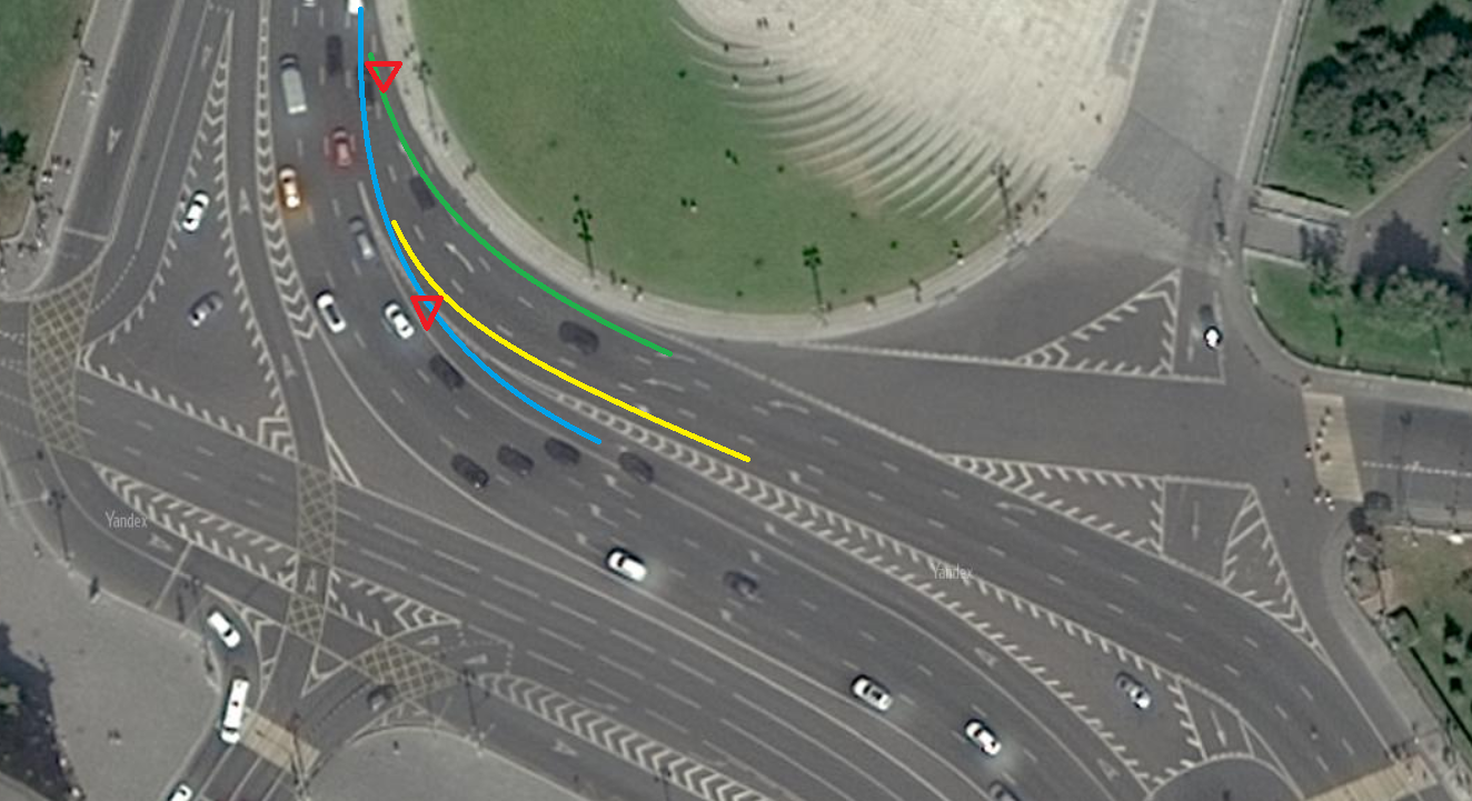 Микроавтобус ехал по синей траектории. В месте, отмеченным красным треугольником, у него заканчивается полоса и он теоретически должен был бы уступить тем, кто ехал по жёлтой траектории. Но там никого не было, поэтому он перестроился в ряд и продолжил движение.