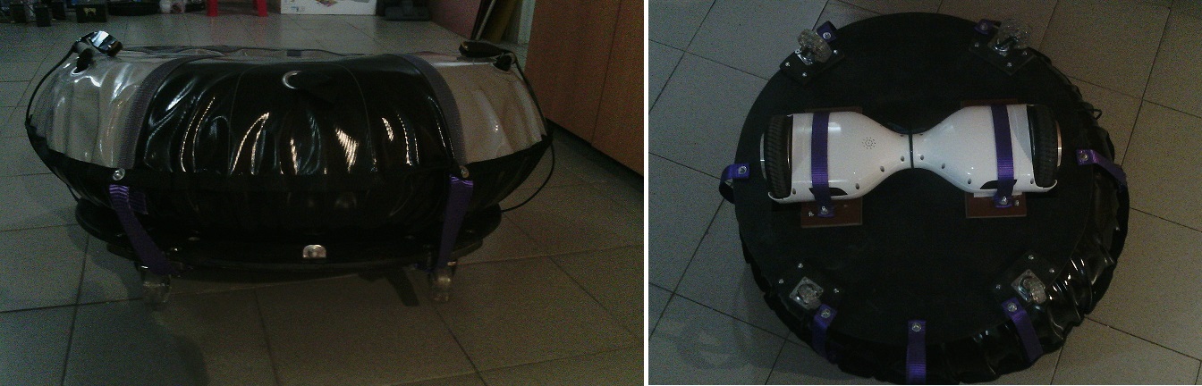 [user]DED[/user], если это возможно, то можно и забайпасить тумблером датчики присутствия. Рычаги однозначно внутрь. Как вариант могу предложить оставить фанерное днище в качестве несущей основы, камеру от спецтехники с большим внутренним отверстием. Вкладыш из стеклопластика для размещения пилота и органов управления вставить внутрь камеры. Но чтоб вкладыш опирался только на камеру и не доставал до фанеры. Тогда будет максимально комфортной езда для пилота. К днищу снизу поворотные колеса. Гироскутер так же к днищу,  но желательно через пружинную/рессорную подвеску, чтобы обеспечить оптимальное сцепление колес с дорогой.
